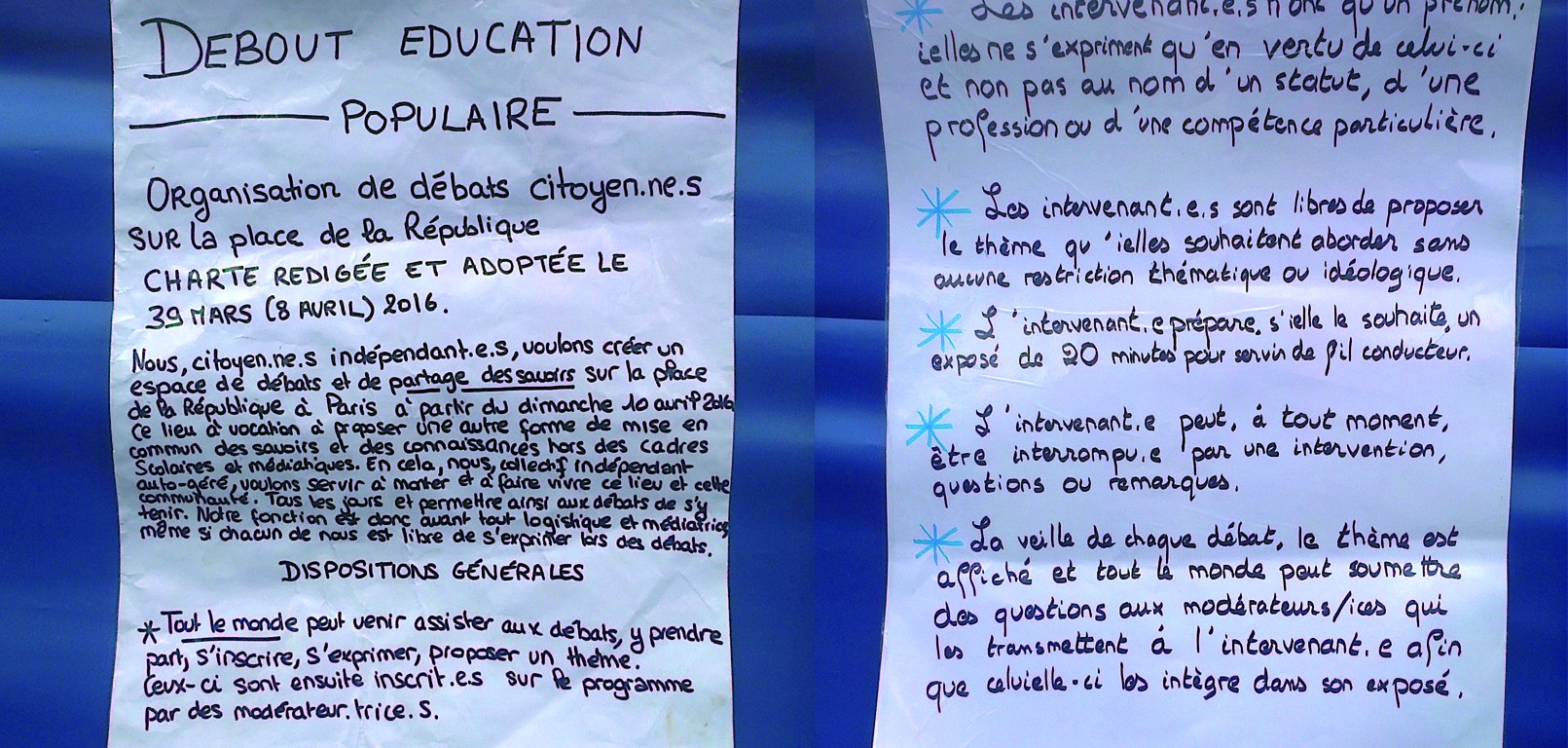 Nous, citoyen.ne.s indépendant.e.s, faisons vivre un espace de débat et de partage des savoirs sur la Place de la République à Paris, depuis le dimanche *41 mars* 10 avril 2016. Ce lieu a vocation à proposer une autre forme de transmission et de mise en commun des savoirs et des pratiques, hors des cadres scolaires et médiatiques. En cela, nous, collectif d’indépendant.e.s,auto-géré, voulons continuer à faire vivre ce lieu et cette communauté quotidiennement et permettre ainsi aux débats de s’y tenir. Notre fonction est avant tout organisationnelle mais chacun.e de nous reste libre de s’exprimer lors des débats, le sujet est choisit par l’intervenant.e, ses propos n’engagent que lui/elle et pas Debout Éducation populaire.